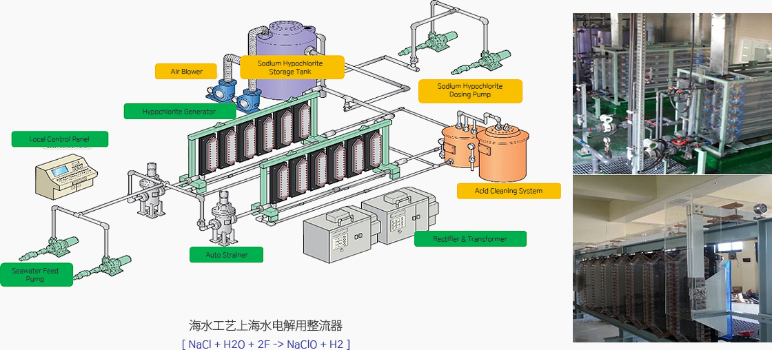 发电厂及然气LNG工艺上的海水,电解海水中氯化钠(NaCl, 约3%),产生次氯酸钠 (NaOCl),投入取水口处,通过再海水系统管道,冷凝器和热转换器的管道来防止贝类,海藻类黏贴,发展而成的大容量整流器